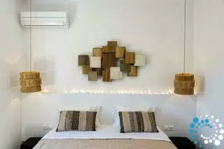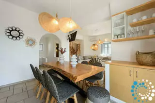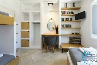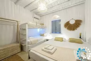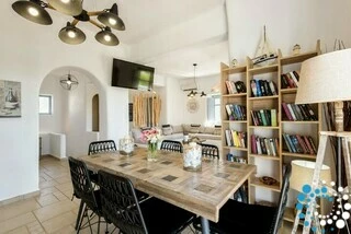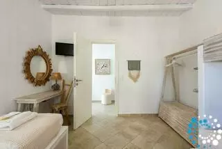 The villa is spread over two levels. On the ground floor, there is a bedroom with a double bed, an ensuite bathroom, and a private terrace. Two additional bedrooms each feature a single (or double) bed and a bunk bed, sharing a common bathroom, alongside a convenient storage room. Upstairs, the first floor opens to a spacious living room with a fully equipped kitchen, including a dishwasher. There is also a bedroom with a double bed and a bathroom on this level. All bedrooms and main areas are air-conditioned to ensure your comfort.