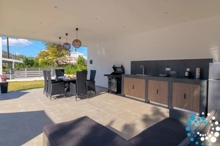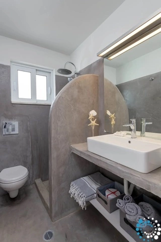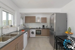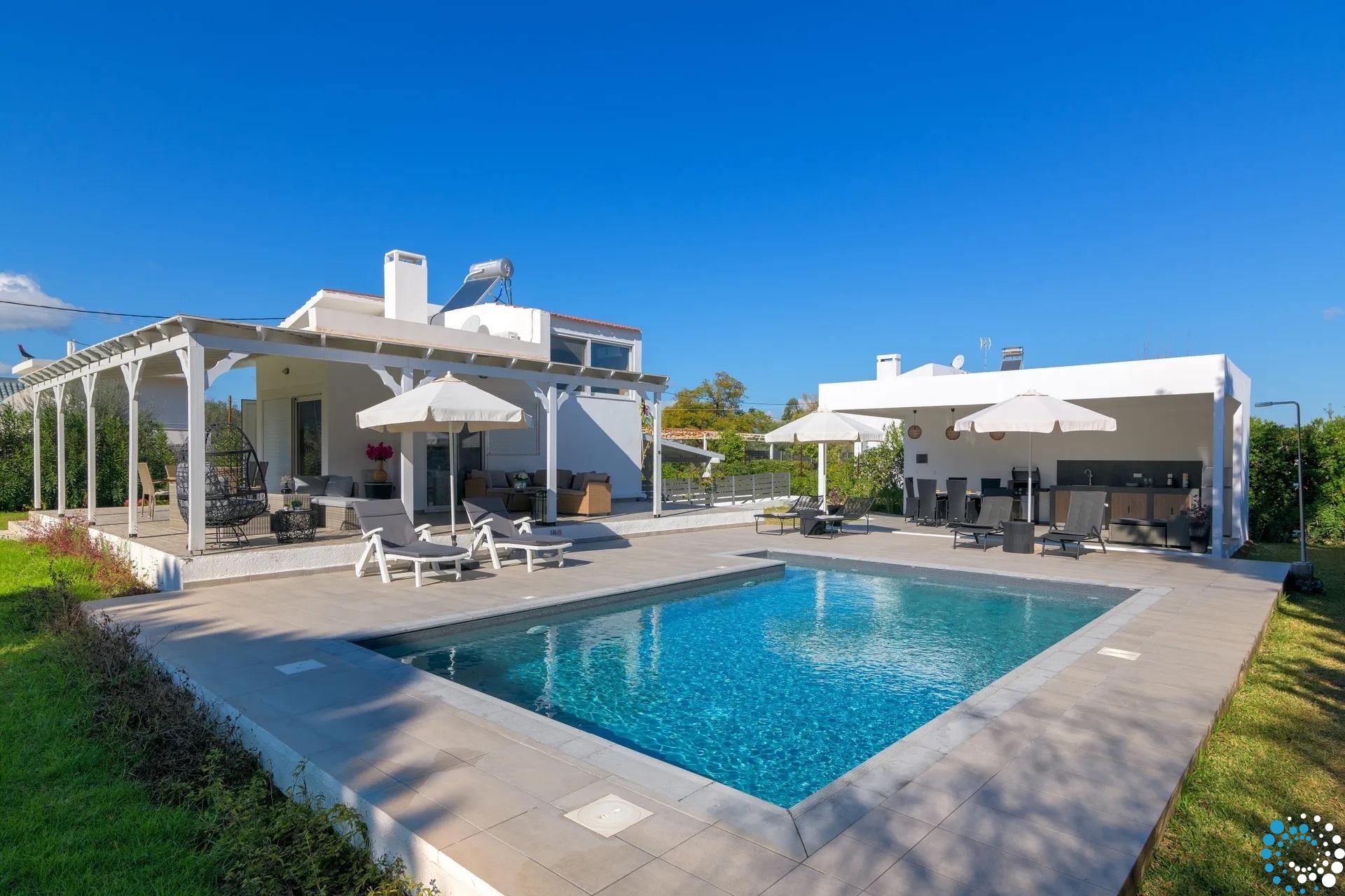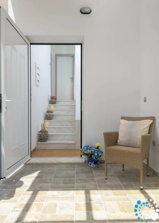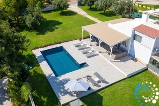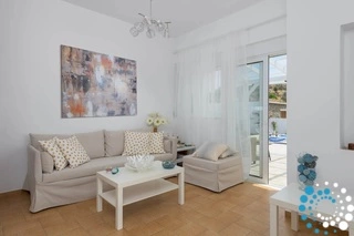 The villa boasts two modern bathrooms with elegant showers and a fully equipped kitchen, perfect for preparing meals at your leisure. The living area is designed for relaxation, featuring a large screen TV with satellite channels, a game console, and complimentary Wi-Fi throughout. Step outside to enjoy the private swimming pool, complete with sunbeds for soaking up the Aegean sun, or gather around the BBQ and outdoor dining area for memorable meals with loved ones.