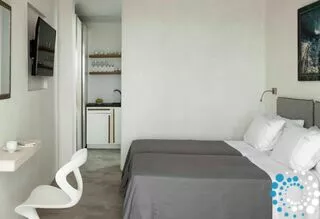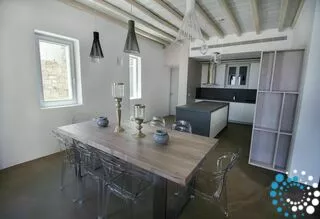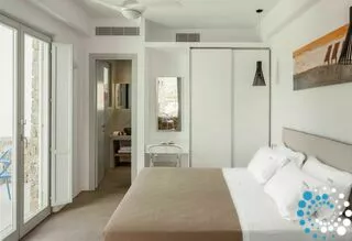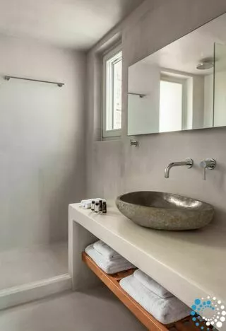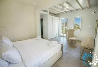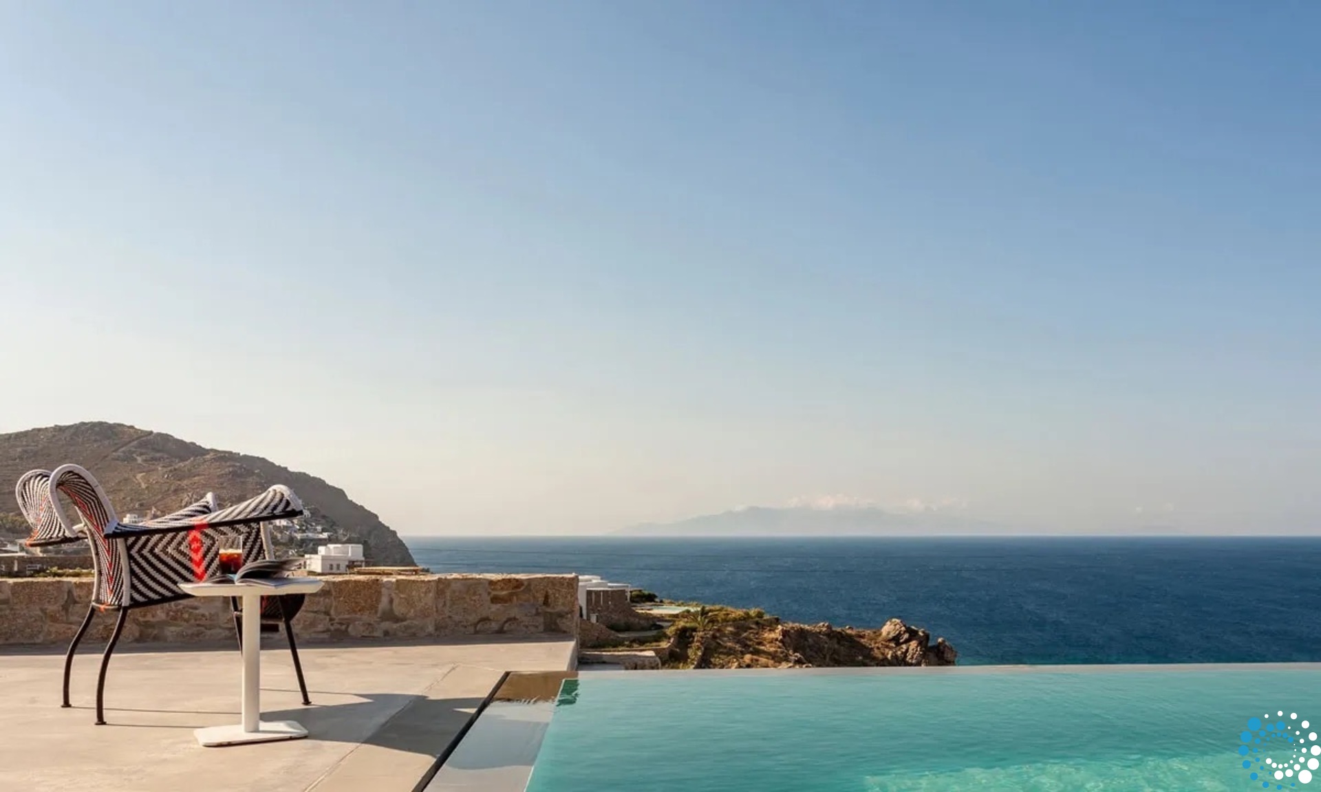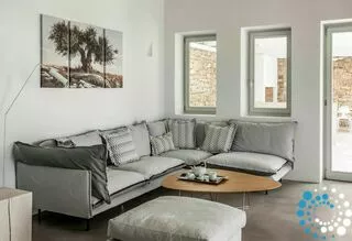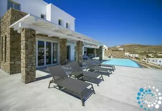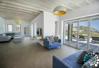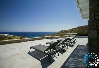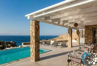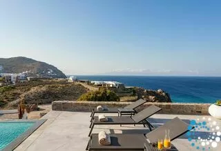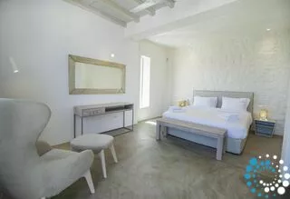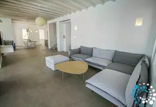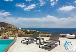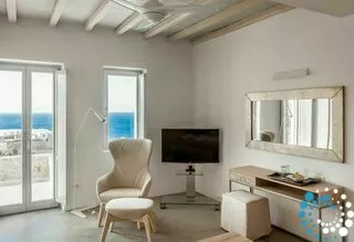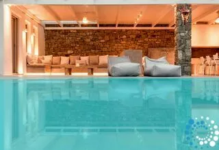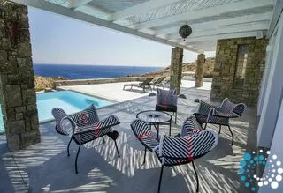 Outdoors, guests can enjoy a large private swimming pool surrounded by elegant lounging areas, plush sunbeds, and a stylish bar and seating space—perfect for relaxing afternoons or lively evening gatherings under the Mykonian sky.