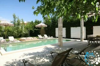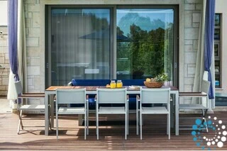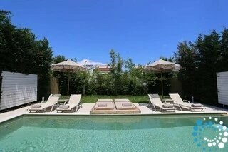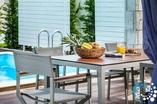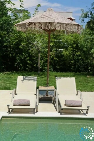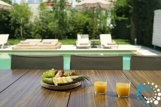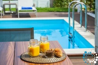 Outside, the villa opens to a spacious private outdoor area designed for comfort and relaxation. A private patio surrounds a 30 m² swimming pool, accompanied by a generous dining space with a dining table, dining couch, and armchairs facing the pool. Sunbeds, umbrellas, coffee tables, and lounge furniture are arranged beside the pool, creating an ideal space for enjoying the sun. The outdoor area also includes a hot-water outdoor shower, a private barbecue, and a private garden, along with dedicated parking spaces for secure parking.