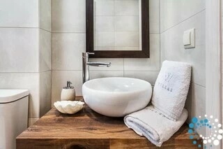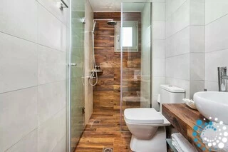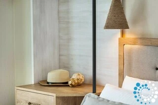 On the ground floor, the villa offers a minimal yet comfortable living room with a sofa-bed and a flat satellite TV, overlooking the pool. The space is complemented by a spacious, fully equipped kitchen with a dining stand and seating area, ideal for relaxed meals. A guest WC is also located on this level. The ground floor includes an accessible bedroom with a queen-size double bed, an en-suite bathroom, and a balcony. In two of the villas, this bathroom is wheelchair-friendly. This bedroom was designed especially for guests who prefer to avoid using stairs daily, or who may have mobility limitations or a disability.