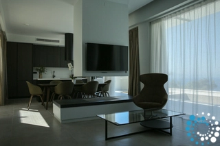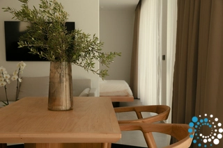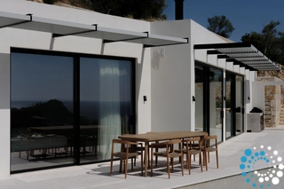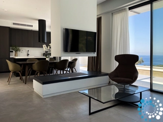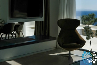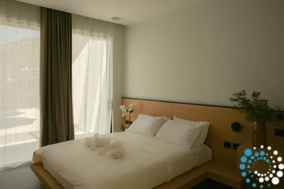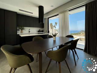 As you step into the property, you’re welcomed by a spacious living area filled with natural light streaming through large glass doors. On one side, you’ll find a fully equipped kitchen with a dining area, while the other side features a generous lounge and dining space, complete with an additional WC. The tall glass doors blur the lines between indoor and outdoor living, offering the quintessential villa experience in Greece.