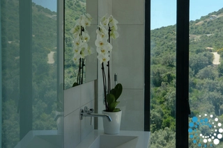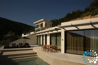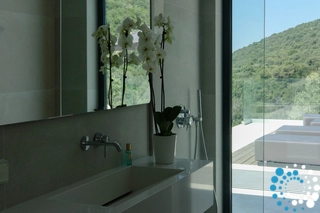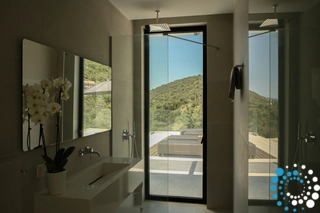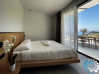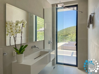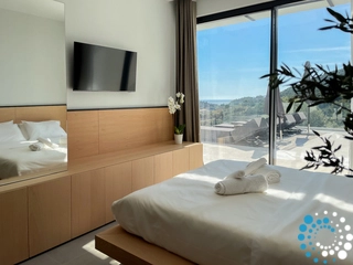 The villa offers two large bedrooms, each with a comfortable double bed. Both bedrooms have their own ensuite bathrooms, and each provides direct access to the stunning outdoor spaces surrounding the villa.