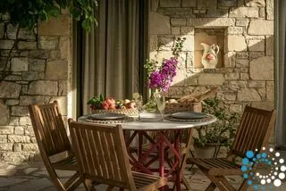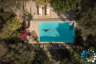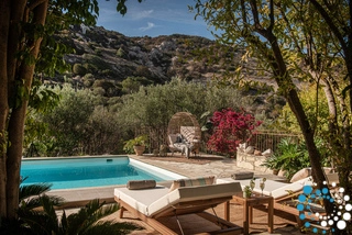 The real winner of the villa is the spacious flagstone terrace. Trees and ivy climbing up the stone walls and pergolas create a lush environment. The villa is surrounded with olive trees and offers views to the hills. The dominant sounds are the rattling cicadas in the midsummer during noon and gentle crickets after sunset and the sea, though concealed, can still be heard roaring on a quiet night.