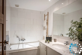 Bathroom is tiled with white marble. The villa is equipped with modern furniture. Original hand-drawn paintings and art-works around the house complete the decoration.