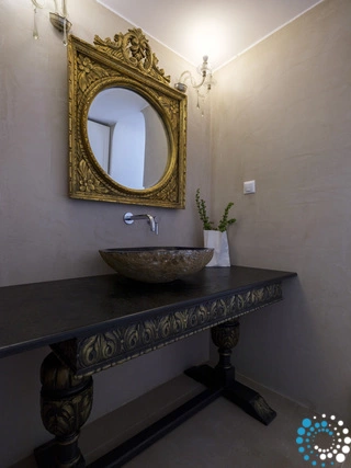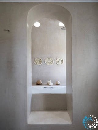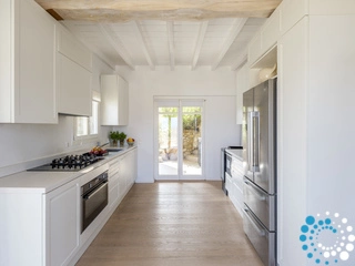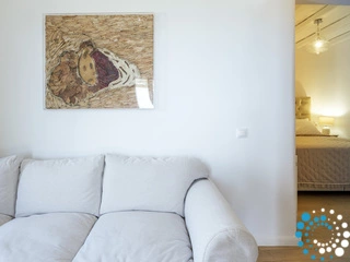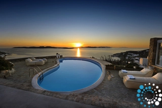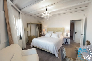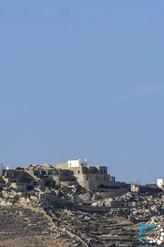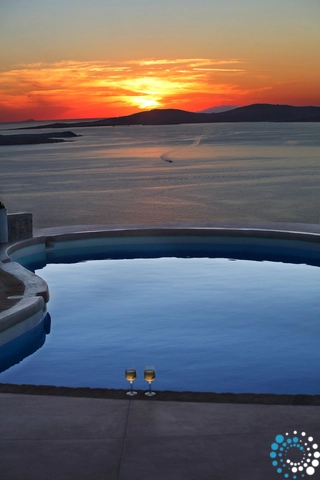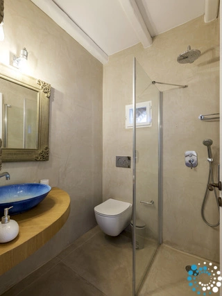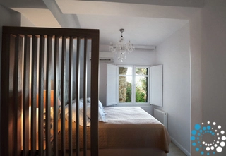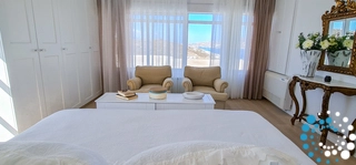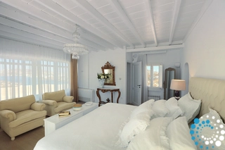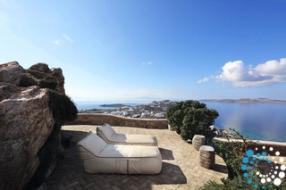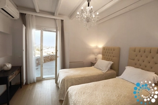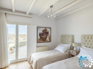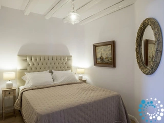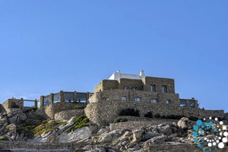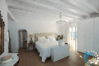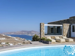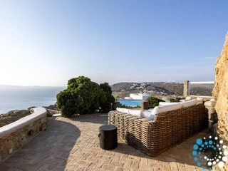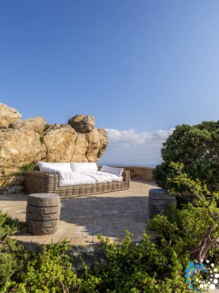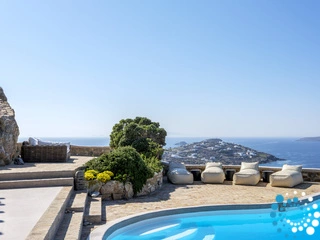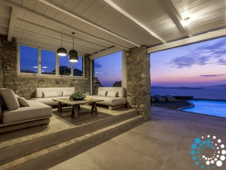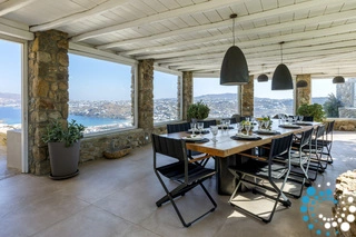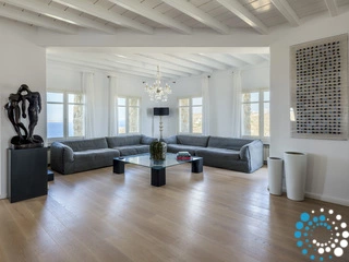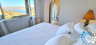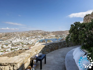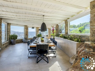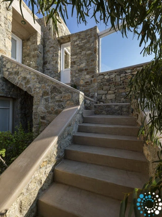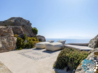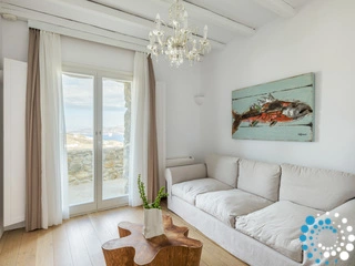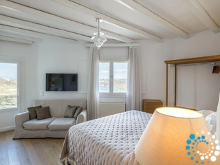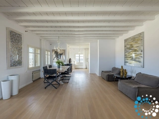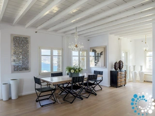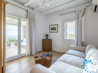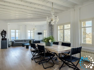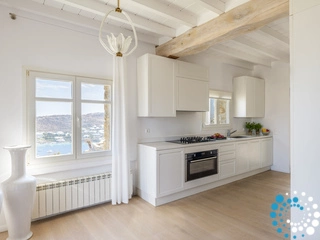 The entrance floor on the lower level features a fully equipped kitchen featuring both gas and electrical appliances, a guest bathroom, and an expansive 75-square-meter living and dining area that offers breathtaking views of the sunset over Agios Ioannis bay, Delos island, and the town harbor.