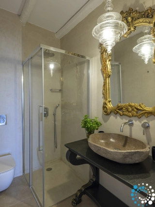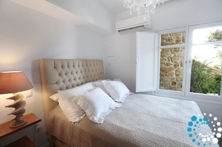 The higher level is dedicated to two further bedrooms, both featuring double beds, air conditioning, and ensuite bathrooms. Each of these upper rooms grants access to a private balcony, providing an elevated vantage point to admire the surrounding seascape.