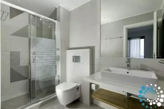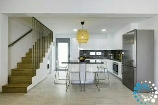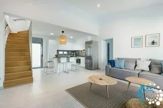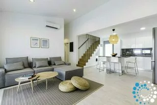 The fully equipped modern kitchen is flooded with natural light thanks to large patio doors and windows, making it a delightful space for preparing meals. Adjacent to the kitchen, the spacious and tastefully designed living room invites you to relax—whether admiring views of the terrace and pool or settling in for a movie night on the comfortable sofa with the 40’’ satellite TV.