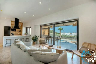 Elegant open-plan living area flooded with natural light, perfect for relaxation or entertainment either indoor or outdoor, marble bathrooms stocked with high-end toiletries, bathrobes, slippers, and pool towels and a fully equipped kitchen ideal for everything from quick breakfasts to chef-prepared meals, reflect a commitment to both luxury and function.