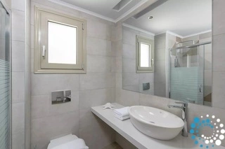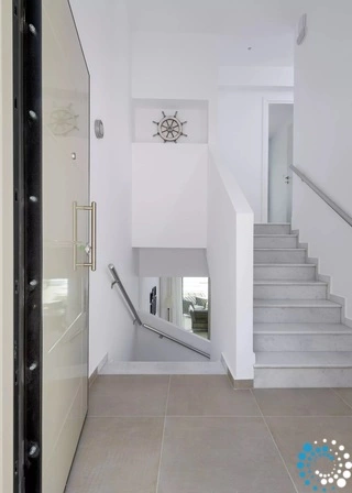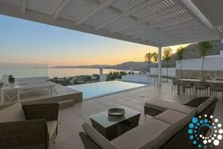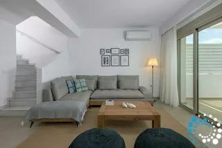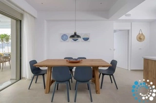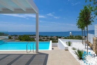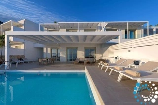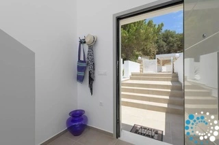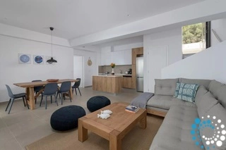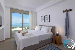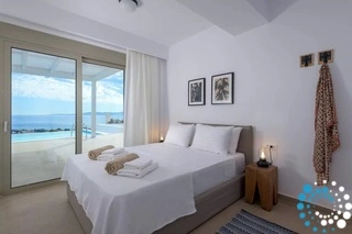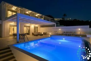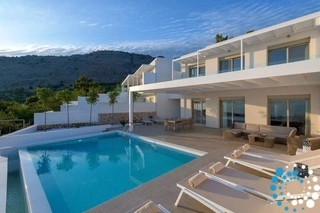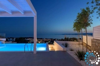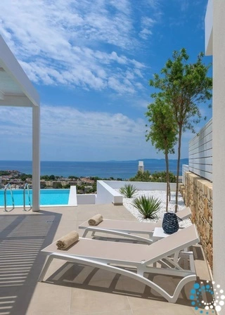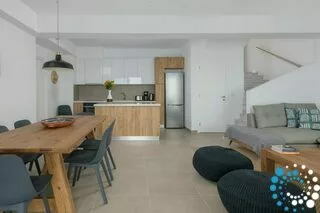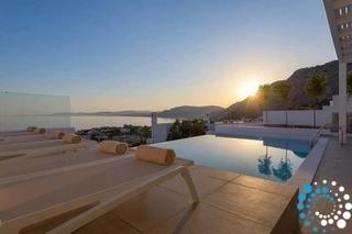 The villa is just 800 meters from Pefkos Beach. It features a private infinity-edge swimming pool that appears to float above the sea. A spacious pergola provides shade over the outdoor dining and lounge areas. The villa offers four beautifully designed bedrooms, accommodating up to eight guests. On the lower floor, there is a bedroom with an ensuite bathroom, alongside an open-plan, fully equipped kitchen, dining area, and living room. The upper floor comprises one bedroom with an ensuite bathroom and two additional bedrooms sharing two bathrooms located in the hallway.