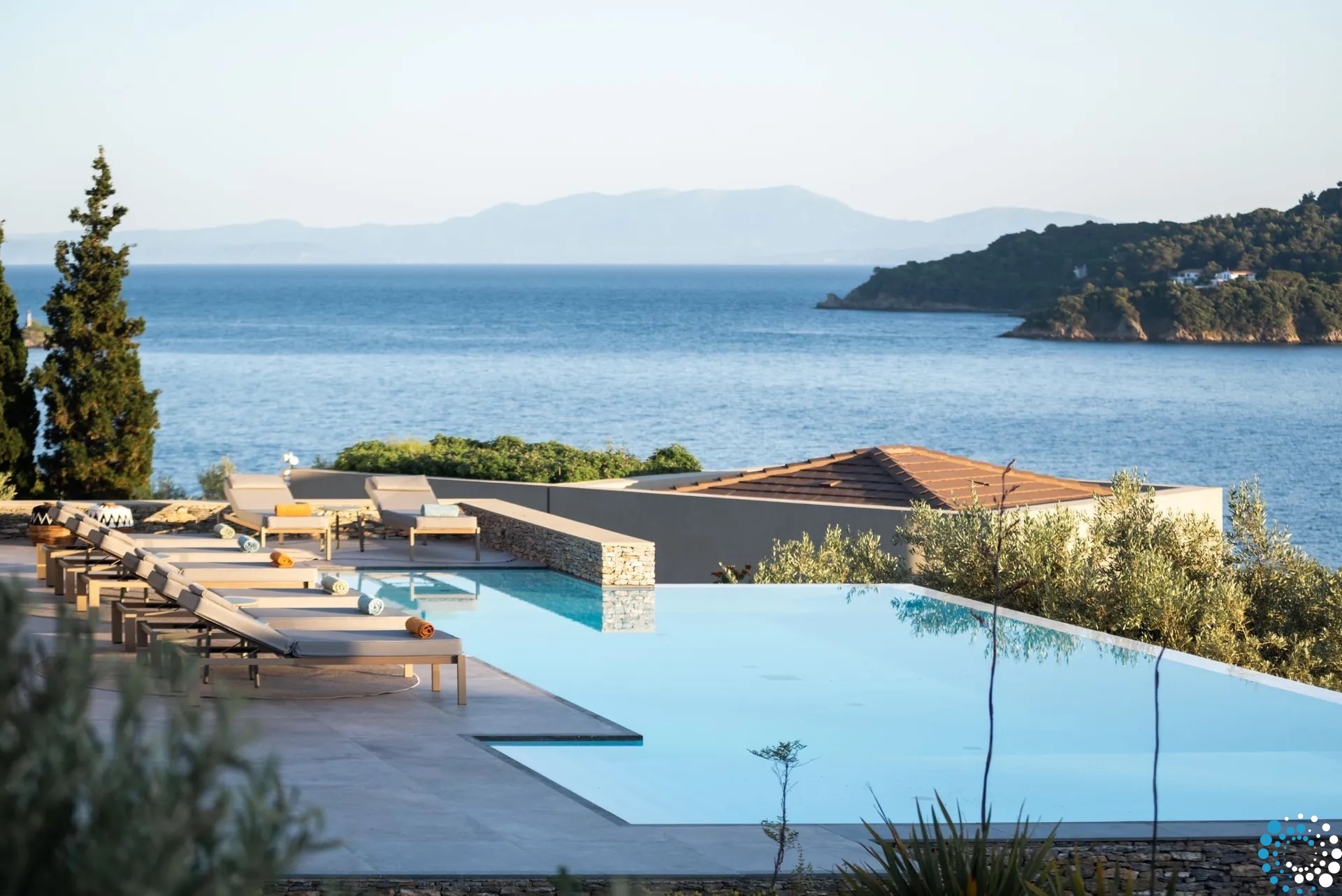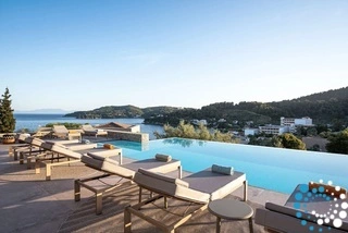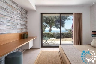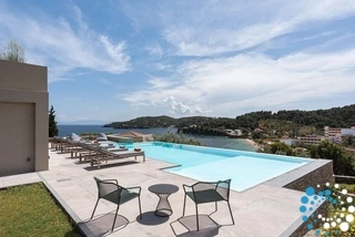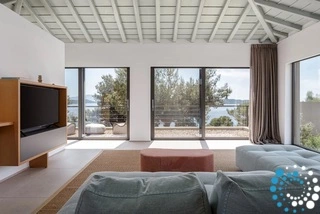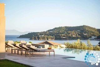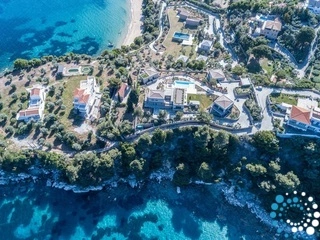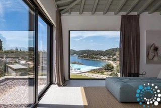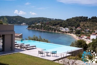 Located on the east coast of Skiathos in Achladies Bay, the villa is set in a picturesque Greek village with a traditional fishing-village charm. A small sandy beach forms a cove surrounded by greenery and crystal-clear waters. Only 2 km from Skiathos town, the location combines serene surroundings with easy access to restaurants, roads, and water taxis that connect directly to the capital.