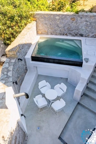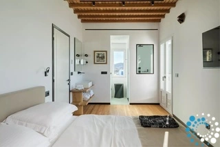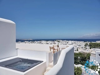 The first floor features a spacious and contemporary residence with a private pool and lounge area. The 3 double bedrooms, each with ensuite bathrooms, boast luxurious beds and amenities. Marvel at the breathtaking Mykonos sunsets and admire the windmills and Aegean Sea from your private pool.