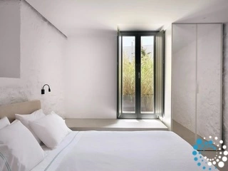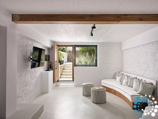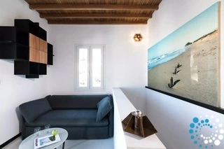 The second floor houses a chic and comfortable 2 Bedroom Suite with a private jacuzzi and uninterrupted Aegean views. Whitewashed walls and ample space create an inviting atmosphere, while the heavenly blue backdrop of the Aegean fills every window.