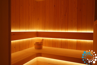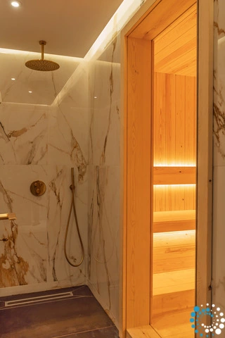 Inside, the ground floor reveals a fully equipped gourmet kitchen, stylish dining areas, and a beautifully appointed living space designed for refined relaxation. A private indoor sauna further elevates the experience, offering a serene retreat dedicated to wellness and rejuvenation.