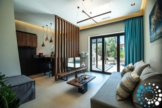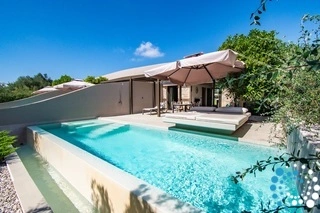 Set within beautifully landscaped, fenced grounds, guests can enjoy an olive tree garden, a relaxing lounge area, and both main and kids’ pools, creating the perfect balance of privacy and shared enjoyment. Designed with nature-inspired architecture, the villas blend stone, wood, and natural materials seamlessly into the surroundings, evoking harmony, tranquility, and timeless elegance.