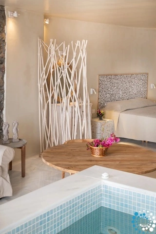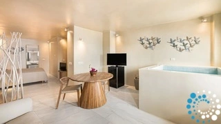 The suite offers a cozy bedroom designed for two, an elegant marble bathroom, a stylish living room, and a charming dining area. Its highlight is the private indoor Jacuzzi, perfect for ultimate relaxation.