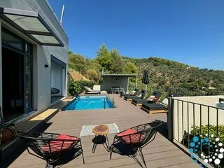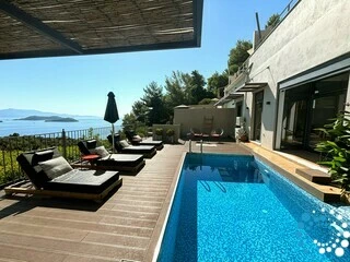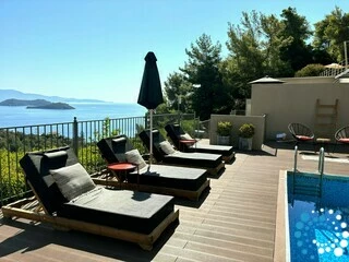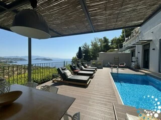 Outdoors the pool is quite deep -dimensions 5,5x3x1,6m- covered with small tiles and facing the sea. The outdoors area of 42 m2 is covered by a wooden deck and features a lounge and sunbeds. Is the most suitable place for relaxing and unforgettable holidays.