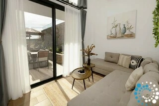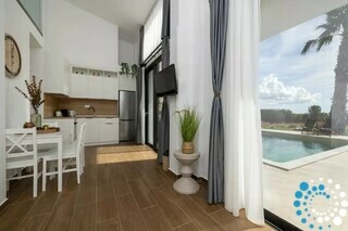 Villa Coral is a serene retreat designed for comfort and relaxation, offering two spacious bedrooms with queen-size beds and premium mattresses to ensure a restful sleep. The villa features two modern bathrooms, perfect for families or friends traveling together. Its fully equipped kitchen comes with a stovetop, oven, fridge, coffee maker, kettle, and all the essentials needed for preparing meals, while the cozy living area, complete with a convertible sofa bed and Smart TV, provides a welcoming space to unwind after a day in the sun. An indoor dining area invites shared meals in a warm, inviting atmosphere.