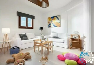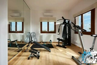 The first floor offers a second light-filled sitting area, perfect for unwinding or socializing. This level also hosts a variety of entertainment options for all ages, including an office space with printer, a cinema room with a PlayStation 4 and 65” HDTV with Netflix, a playroom for young children, and a fully equipped gym with an exercise bike, multifunctional gym machine, mats, abs bench, stepper machine, and yoga mat. A family bathroom with a bathtub and double sinks completes the first floor.