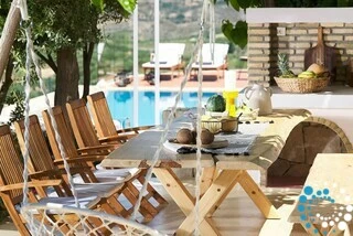 Upon entering Villa Daisy, you are welcomed into a spacious open-plan area that seamlessly blends the living room and kitchen. The living area is perfect for relaxing, featuring plush sofas, an open fireplace, and a 65” satellite HDTV with Netflix. From here, French doors open onto a veranda furnished for outdoor lounging, which leads directly to the pool and landscaped garden. The fully equipped kitchen is a chef’s delight, with top-quality appliances, a wine cooler, and a tap water filter, alongside a large wooden table perfect for group dining. On the ground floor, you will also find a bedroom with a king-size bed and an adjacent bathroom, as well as a separate bathroom featuring a Jacuzzi bathtub, shower cabin, and laundry facilities with washing machine and tumble dryer.
