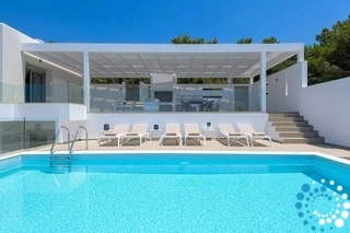A love for the outdoors becomes immediately evident as guests step onto the main terrace of this vacation rental. A private swimming pool with an infinity-edge seems to hover over the sea. A large pergola covers the entertainment and relaxation areas. Three exquisite bedrooms accommodate up to six guests at this villa. The lower level includes three bedrooms and three bathrooms. The upper level is made up of plan fully equipped kitchen, a dining and a living room.