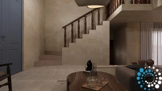 A few steps up leads you to the main entrance of the villa, where a welcoming living room with a charming fireplace creates the perfect setting for relaxing evenings.