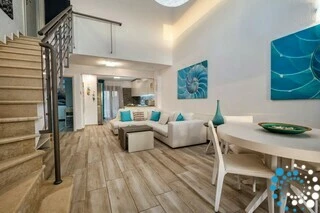 The ground floor invites you into a bright living room, a fully equipped kitchen, a dining area, a contemporary bathroom, and a cozy bedroom with two single beds. Upstairs, the master suite features a double bed and a private bathroom, ensuring a serene retreat for ultimate relaxation. Both bedrooms are fully air-conditioned and come with satellite TV, combining comfort with convenience.