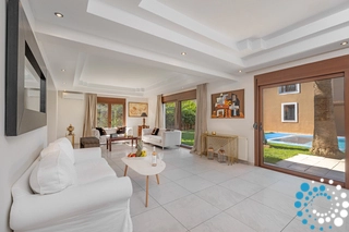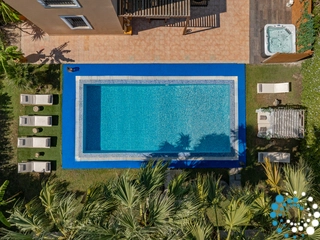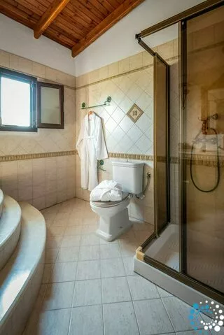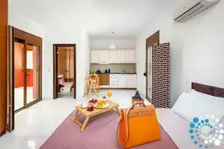 Villa 2 (400m²) offers its own paradise with expansive living areas and cozy bedrooms. The ground floor features a fully equipped kitchen, a dining area, two living rooms, an additional WC, and one bedroom with a large double bed along with its private en-suite bathroom. The first floor offers three additional bedrooms, each with double beds and extra single beds. One of the bedrooms includes an en-suite bathroom, and a large shared bathroom with a bathtub and shower is also available.