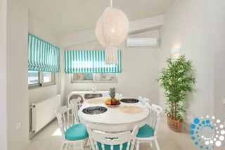 Bedroom 2 is located on the upper floor and features a spacious balcony with a captivating sea view. The room is newly furnished, with mattresses designed to ensure a restful night’s sleep. Decorated in serene white and beige tones, it exudes tranquility and a soothing atmosphere. The generously sized bathroom is equipped with a shower cabin and a large bathtub, offering a luxurious and relaxing experience.