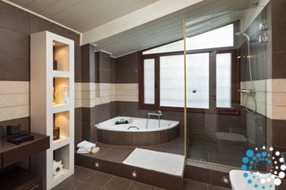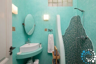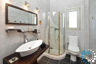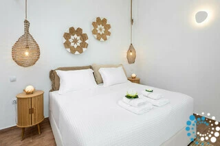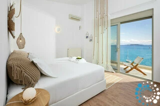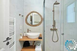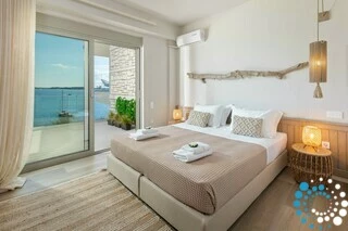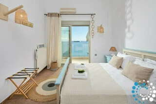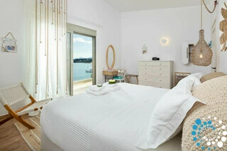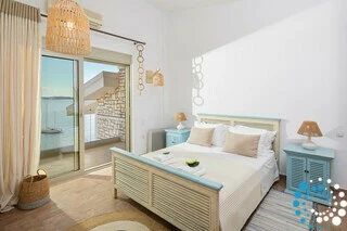 Bedroom 1 shares the same large balcony as Bedroom 2 and offers a stunning sea view. Decorated in calming blue and beige tones and featuring a new mattress, this room creates a peaceful and relaxing atmosphere. The bathroom includes a unique pebbled shower cabin, elegant black tiles, and a window overlooking the sea, enhancing the room’s luxurious ambiance.