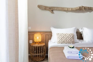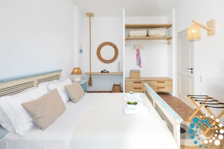 Bedroom 3 is situated on the lower floor and shares a spacious deck balcony with Bedroom 4. This deck provides easy access to the pool via a short flight of stairs. The room is decorated in soft, soothing colors with boho-style furniture and lighting, creating a serene and cozy atmosphere. The deck itself is perfect for unwinding, with a hammock and a sitting area overlooking the pool and the sea. The bed in Bedroom 3 can be configured as either a queen bed or two single beds, offering flexible sleeping arrangements.
