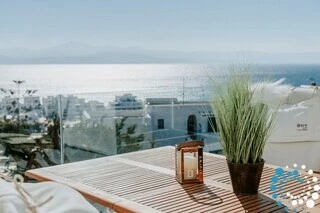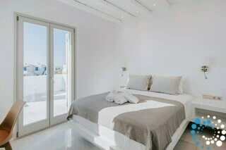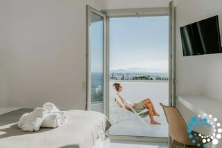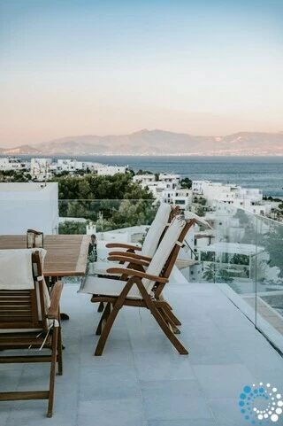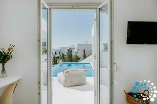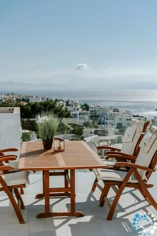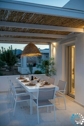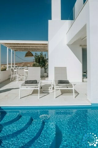 In a quiet location overlooking the picturesque harbor of Piso Livadi and opposite the island of Naxos, Villa Galazia is part of a complex of the three villas which are located amphitheatrically and at a distance of 5' on foot from Piso Livadi and 5' on foot from the award-winning blue flag for the crystal clear waters of Logaras beach. Each has a private pool and also each has absolute privacy. From the large terraces you can gaze at the Aegean Sea. In the villas there is the possibility of cooking meals and the provision of breakfast upon request for an additional fee.