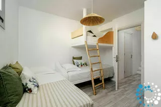 The lower level features two bedrooms. The master bedroom includes a double bed and a private bathroom, while the second bedroom has a single bed and two bunk beds, ideal for children or friends. A second bathroom adds extra convenience for all guests.