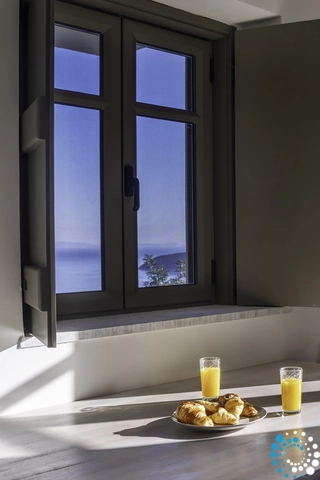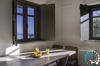 Inside, the villa is bathed in natural light, with clean lines and earthy materials creating a serene, inviting atmosphere. Expansive openings blur the boundary between indoors and outdoors, framing uninterrupted views of the sea, the olive grove, and the surrounding landscape.