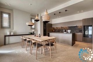 The bespoke kitchen, fully equipped with high-end Gaggenau appliances, is a culinary haven. It’s ideal for both casual meals and formal dining experiences, with ample space and top-tier amenities to satisfy any gourmet enthusiast.