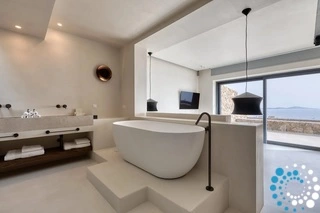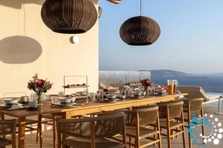 The villa’s expansive terrace is an outdoor sanctuary. Centered around a heated infinity pool (heating upon request), the space includes stylish sun loungers, a shaded alfresco dining area, and cozy lounge spots for entertaining or unwinding. The panoramic views of the Aegean Sea and spectacular sunsets create a magical atmosphere for any time of day.