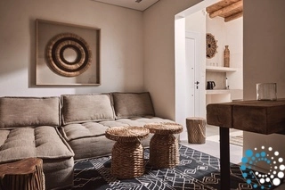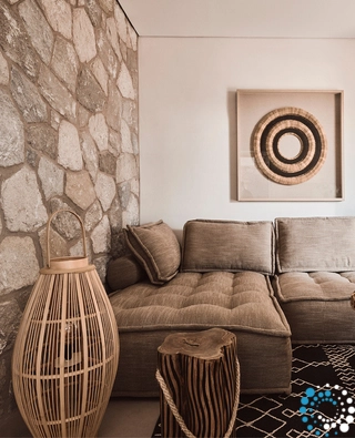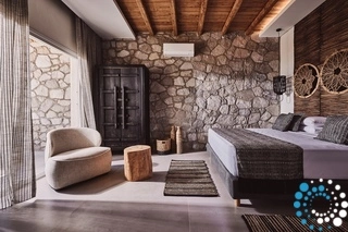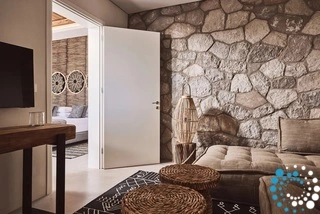 Inside the villa, warm earthy hues dominate the décor, complemented by wooden furniture that brings a natural, serene vibe. Stone accents are used throughout, generating a relaxing atmosphere while keeping the interiors cool during the hot summer months.