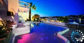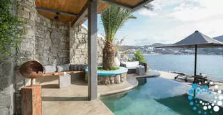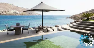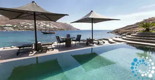 This villa belongs to a 5-star Hotel. An architectural oasis, this beachfront resort treats its guests to a plethora of premium services and amenities. Its world-class facilities include impressively decorated and luxuriously appointed rooms and suites, an incredible villa with a private pool and a secluded beach area, two swimming pools with open-air Jacuzzis, a SPA, a state-of-the-art fitness center, a private beach, restaurants and bars, an art gallery, a boutique, a hair salon, a scenic chapel within its premises, and a private yacht anchored in Ornos bay.