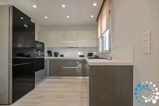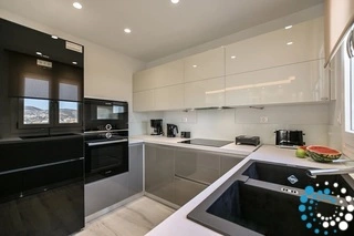 The luxurious kitchen is fully equipped with modern appliances such as a coffee maker, microwave, kettle, toaster, sandwich maker, and dishwasher. A washing machine is also available for guests’ convenience.