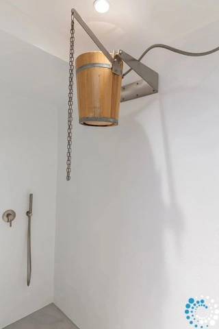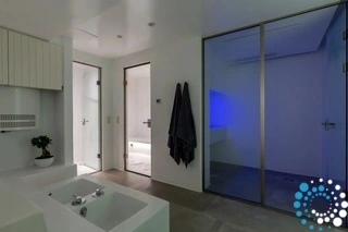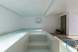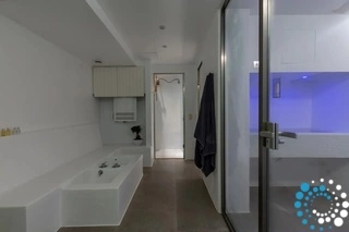 The basement includes two personnel bedrooms — one with two single beds and one with a single bed — both with en-suite bathrooms. This level also houses a fully equipped gym featuring two treadmills, a stationary bicycle, a multi-functional fitness machine, dumbbells, gym mats, and two 65-inch smart TVs. A dedicated massage room is fitted with a professional massage table. Additional wellness amenities include a steam room, jacuzzi, feet spa, and a cold barrel shower.
