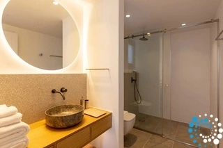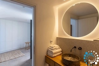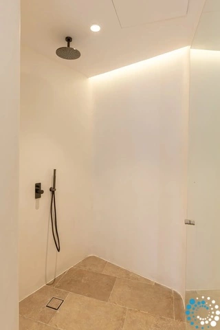 On the first floor, you'll find four master bedrooms, each with a king-size bed, en-suite bathroom, and private balcony shaded by pergolas. All rooms offer beautiful views of the sea and pool. The level is also secured with access-controlled electric sliding doors.