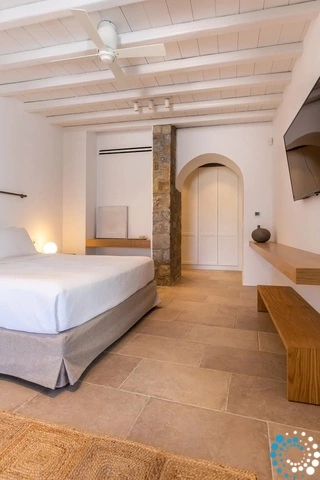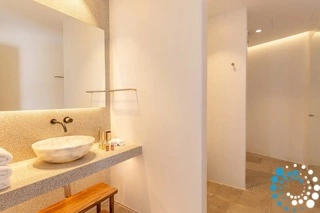 On the entrance level, there are two bedrooms with queen-size beds and en-suite bathrooms, offering direct access to sea or pool views through balcony doors. Additionally, there are two more bedrooms with queen-size beds, en-suite bathrooms, kitchenettes, sea or pool views, and private entrances. Three master bedrooms on this level feature king-size beds, en-suite bathrooms, kitchenettes, and also have private entrances and views of the sea or pool.