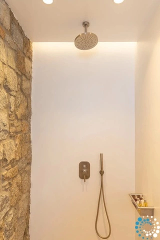 There is an additional bedroom with two single beds and an en-suite bathroom intended for chefs, along with a guest WC near the living room. The infinity swimming pool, around 120 square meters, offers a stunning unobstructed view of the sea. Nearby, a shaded BBQ area is equipped with professional-grade appliances including two dishwashers and two refrigerators.