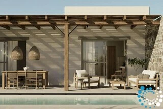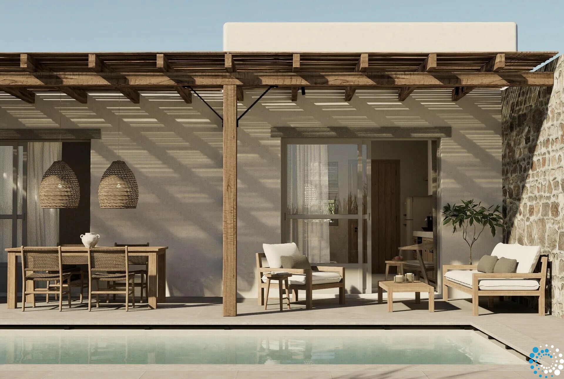 Outside, the private pool terrace becomes the natural center of daily life. With a pool of approximately 40 square meters, the space opens toward Mount Dikeos and the surrounding landscape, offering ever-changing views throughout the day. Fully furnished for lounging, dining, and barbecuing, the terrace invites long, sun-filled hours and effortless outdoor living.