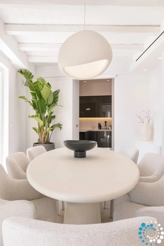 Relax in the stylish living spaces, energize in the state-of-the-art gym, or savor a meal in the elegant al fresco dining area. Villa Koruphe exudes a refined sense of tranquility, perfectly balanced with modern luxury. Its prime location near Mykonos’s most iconic spots allows you to effortlessly explore the island’s vibrant culture, exquisite dining, and lively nightlife.