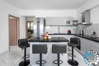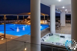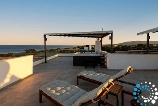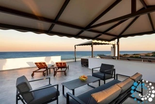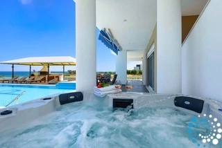 Outside, the villa is surrounded by beautifully landscaped gardens, with a heated pool and jacuzzi, complete with parasols and sunbeds for ultimate relaxation. Guests can unwind on the furnished balconies or enjoy the rooftop jacuzzi with panoramic views. A BBQ area and comfortable outdoor seating make it ideal for dining al fresco, and sunbeds at the nearby beach enhance the experience of island life.