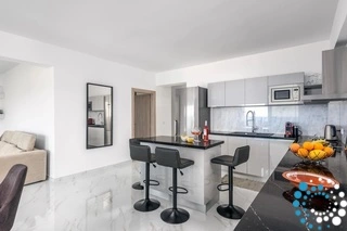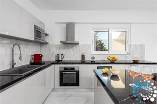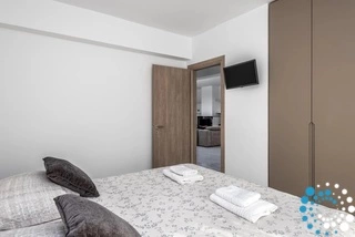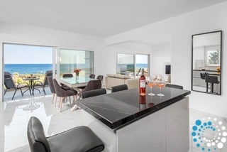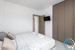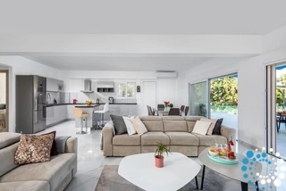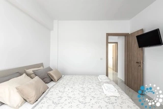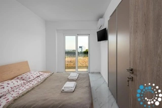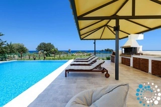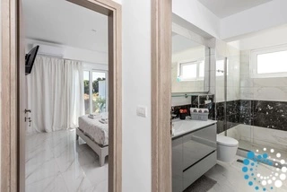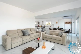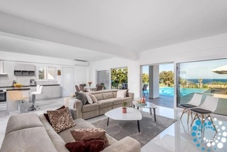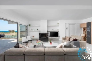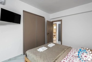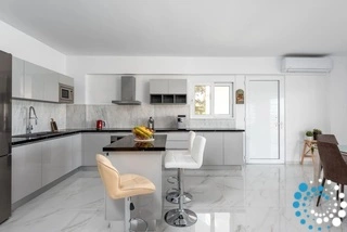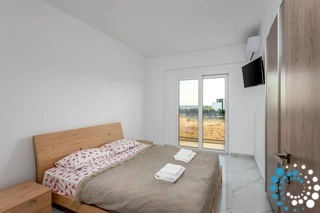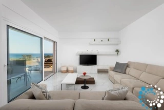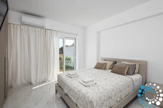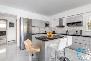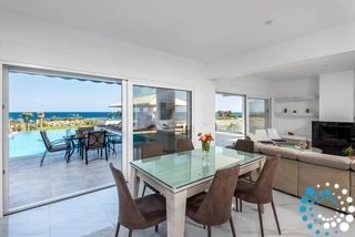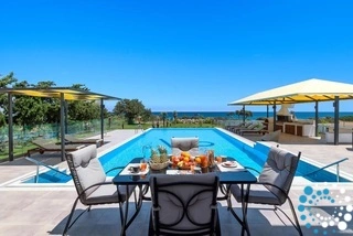 Villa Kyklamino offers a luxurious and relaxing retreat with five fully air-conditioned bedrooms, each featuring double beds and flat-screen TVs. The spacious living room includes two single sofa beds, creating extra sleeping space for guests. There are two modern bathrooms with showers and an additional outdoor WC for convenience. The open-plan kitchen is fully equipped, making meal preparation easy and enjoyable, and the dining area flows seamlessly into the living space, perfect for gathering with family or friends.