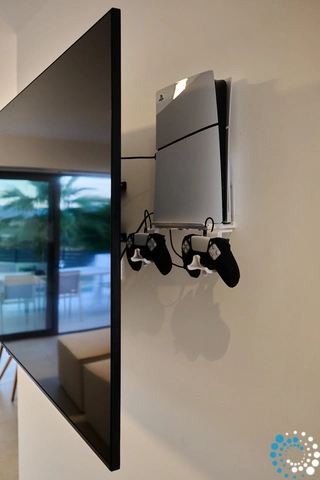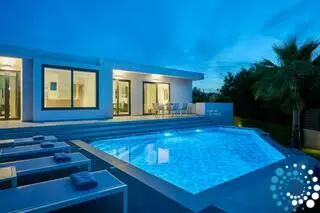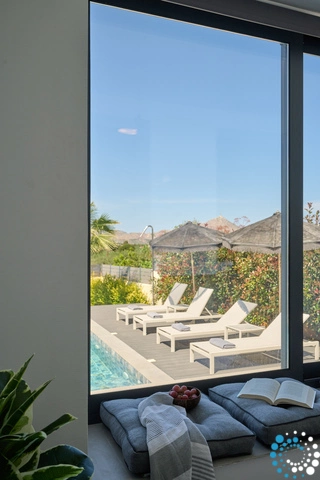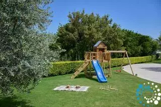 Inside, the villa features four spacious bedrooms and three contemporary bathrooms, along with a fully equipped kitchen and a cozy living and dining area, perfect for family gatherings or relaxing evenings. Outside, you’ll find a large swimming pool with breathtaking views of Mount Skloka, surrounded by an expansive garden with a lush lawn and a playground that promises endless fun for children.