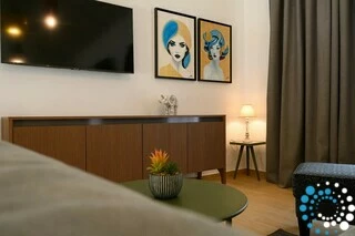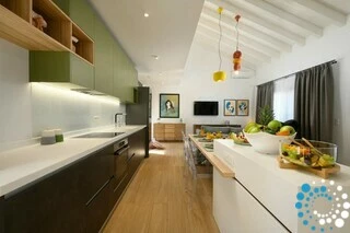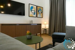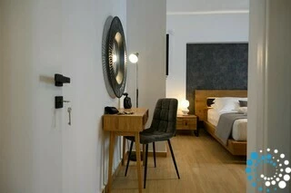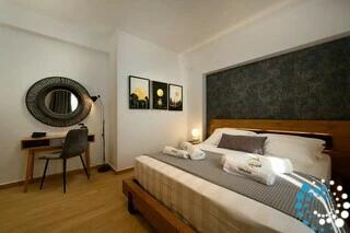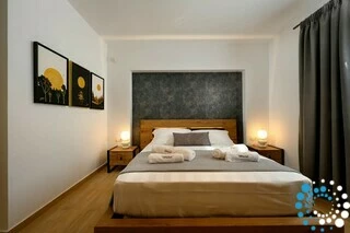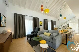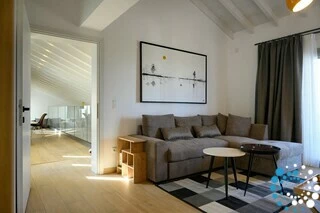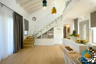 Accommodating up to six guests, Villa Lamperi is perfectly suited for both intimate escapes and stays with family or friends. The interiors combine modern convenience with refined design, creating an atmosphere of comfort and sophistication throughout the property. On the ground floor there is a spacious living area furnished with stylish wooden pieces, a television, a dining space, and a fully equipped contemporary kitchen, along with a sofa bed for additional guests. On this level there are also two large en suite bedrooms, each featuring king size double beds and generous wardrobe space.