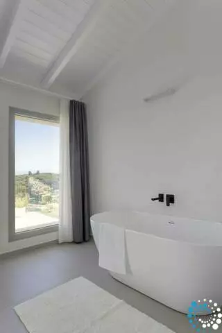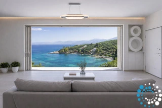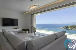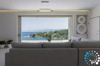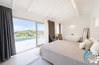 The accommodation is arranged over two floors. The main entrance opens onto the ground floor, revealing a luminous and sociable open space divided into three areas. To the left lies a contemporary kitchen with a wall of white cabinetry and a central island. Straight ahead, a large L-shaped sofa faces a full wall of sliding glass doors that open completely toward the sea and the headland of Kassiopi. Beyond the lounge is a dining area sharing the same impressive views. With its minimalist aesthetic, white walls and ceilings, pale sandy flooring and bright airy atmosphere, this space perfectly expresses the villa’s overall style.